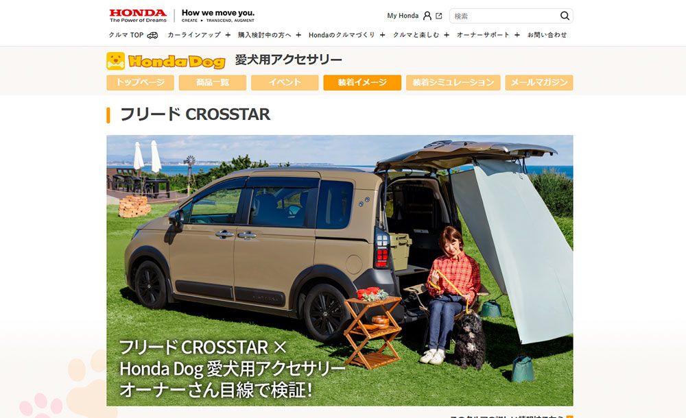 ホンダアクセス様のHP内コンテンツ。HONDADOG愛犬用アクセサリー「FREED CROSSTAR×」。